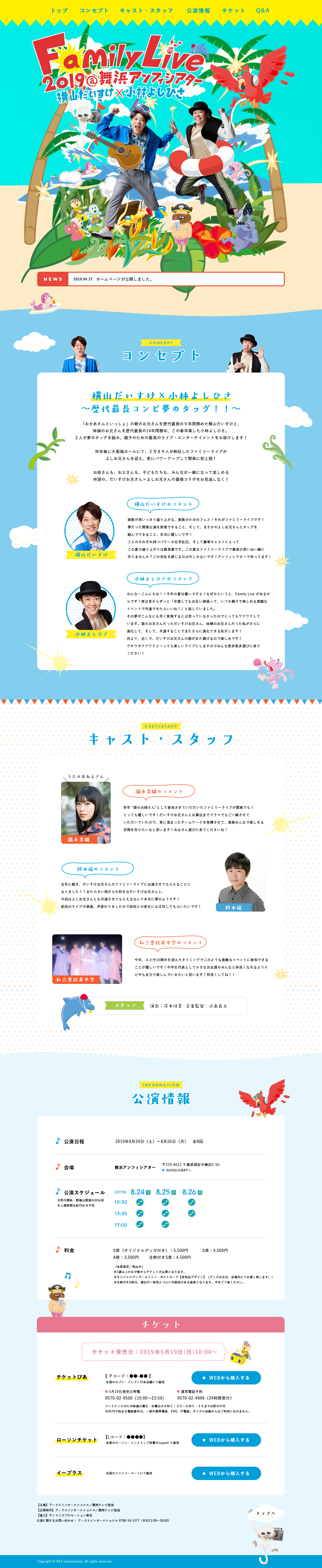 横山だいすけ、小林よしひさの歴代歌のお兄さんがタッグを組んだfamily live 2019のwebサイトのデザインとコーディングを行いました。